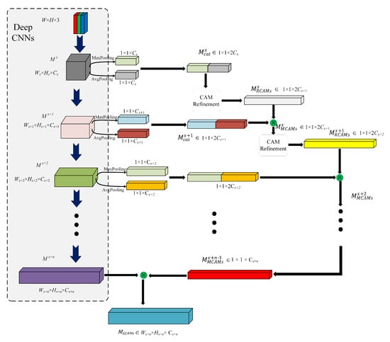 The acquired are then multiplied with concatenated CAMs in next feature level of deep CNNs, as can be expressed as: