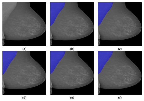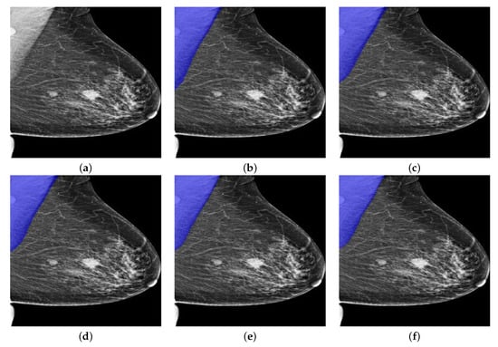 A segmentation example from INbreast by Deeplabv3+ with different backbones. (a) Pre-processed image. (b) : 97.99% of IoU, 99.80% of GPA, 96.85% of DSC, 93.89% of Jaccard, 100% of Sensitivity, and 99.60% of Specificity. (c) : 98.60% of IoU, 99.86% of GPA, 97.39% of DSC, 94.92% of Jaccard, 100% of Sensitivity, and 99.72% of Specificity. (d) : 98.15% of IoU, 99.82% of GPA, 96.82% of DSC, 93.83% of Jaccard, 100% of Sensitivity, and 99.63% of Specificity. (e) : 98.87% of IoU, 99.83% of GPA, 98.08% of DSC, 96.23% of Jaccard, 98.04% of Sensitivity, and 99.99% of Specificity. (f) : 99.21% of IoU, 99.88% of GPA, 98.28% of DSC, 96.62% of Jaccard, 99.89% of Sensitivity, and 99.86% of Specificity.