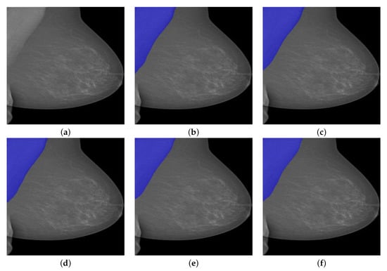A segmentation example from OPTIMAM by Deeplabv3+ with different backbones. (a) Pre-processed image. (b) : 98.29% of IoU, 99.73% of GPA, 97.70% of DSC, 95.50% of Jaccard, 99.89% of Sensitivity, and 99.72% of Specificity. (c) : 99.18% of IoU, 99.87% of GPA, 98.35% of DSC, 96.75% of Jaccard, 99.90% of Sensitivity, and 99.87% of Specificity. (d) : 99.35% of IoU, 99.90% of GPA, 98.64% of DSC, 97.32% of Jaccard, 100% of Sensitivity, and 99.89% of Specificity. (e) : 98.87% of IoU, 99.83% of GPA, 98.08% of DSC, 96.23% of Jaccard, 98.04% of Sensitivity, and 99.99% of Specificity. (f) : 98.99% of IoU, 99.85% of GPA, 98.30% of DSC, 96.65% of Jaccard, 98.15% of Sensitivity, and 100% of Specificity.
