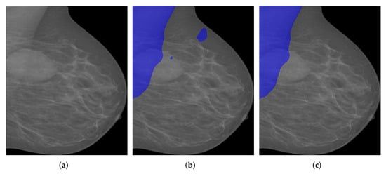 A segmentation example by when tumor is adjoining to pectoral muscle. (a) Pre-processed image. (b) Original segmentation results by . (c) Post processed segmentation results.