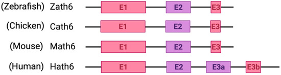 Schematic representation of exons and introns of Atoh8 in different orthologues. Zebrafish atonal homolog 6 (Zath6); Chicken atonal homolog 6 (Cath6); Mouse atonal homolog (Math6); Human atonal homolog 6 (Hath6).