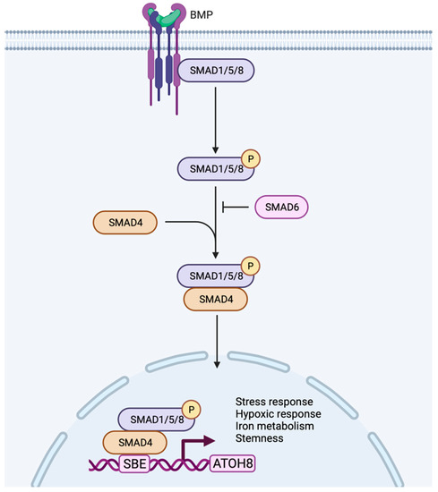 Working model of Atoh8 activation by canonical BMP signaling pathway. In the canonical pathway, BMPs transduce their signal by assembling type I or type II receptors to form a hetero-tetrameric complex. The assembly of receptors initiates transphosphorylation of type I receptors by type II receptors which further phosphorylates and activates R-Smads (Smad 1/5/8). The activated Smad1/5/8 interacts with Co-Smad (Smad4) to form a complex that further translocate into the nucleus to bind to the Smad Binding Element (SBE) of Atoh8 to initiate its transcription. Based on the current literature, the activated Atoh8 can be considered to regulate stress response, hypoxic response, iron metabolism and stemness of the cells.