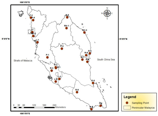 Based on the recent literature [,,,], the number of papers published on human health risk assessment (HHRA) of PTMs in soils from different areas in the world will continue to increase in the future as they are closely related to the public health of both children and adults. The HHRA of PTMs in soils collected from different land uses had been reported mainly from China [,,]. However, HHR due to metal contamination in different land uses from Malaysia have not been studied intensively. Therefore, in the present study, various sampling sites including landfill, industrial, residential, rubbish heap, and abandoned mining and plantation areas in Peninsular Malaysia were investigated. The specific objectives of this study were (1) to determine the concentrations of PTMs (Cd, Cu, Zn, Pb, and Ni), and (2) to assess the potential ecological risks and the HHRA of PTMs, in topsoils collected from different land uses in Peninsular Malaysia.
