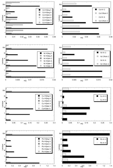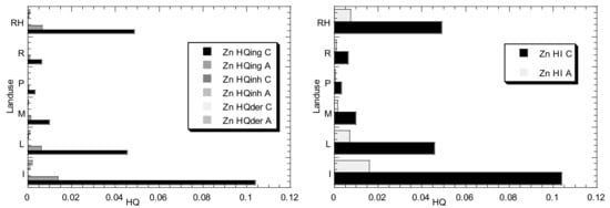 The HQ is the proportion of the ADD of a metal to its reference dose (RfD) for the similar exposure pathway(s) []. The RfD (mg/kg day) is the maximum daily dose of metal from a particular exposure pathway, for both children and adults, that is accepted not to prompt a considerable risk of harmful effects to sensitive individuals during a lifetime. The RfD (mg/kg day) values of Cd, Ni, Cu, Pb, and Zn used in the present study for ingestion, inhalation, and dermal contact, are presented in Table 3. If the ADD is less than the RfD value (HQ ≤ 1), it is viewed as that there will be no adverse health effects, while if the ADD surpasses the RfD value (HQ > 1), there will likely be harmful health effects [,].