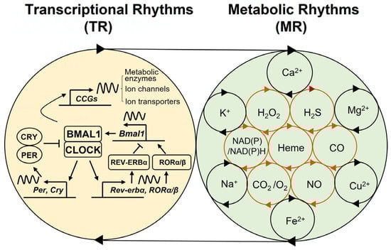 Coupled-cellular oscillators. Bidirectional regulation between transcriptional and metabolic rhythms. The auto-regulatory feedback cycles between the CLOCK/BMAL1 transcriptional activator complex and its transcriptional repressors (PER/CRY, REV-ERBα) and activators (RORα/β), constituting the molecular clock oscillator. This oscillator drives the expression of multiple clock-controlled genes (CCGs), such as metabolic enzymes, ion channels, and transporters. The transcriptional rhythms (TR) mediate metabolic rhythms (MR) involving the cyclic synthesis, degradation, and transport (e.g., influx/efflux) of redox factors, gases, and ions, which, in turn, provide feedback that regulates the TR, constituting coupled-cellular oscillators.