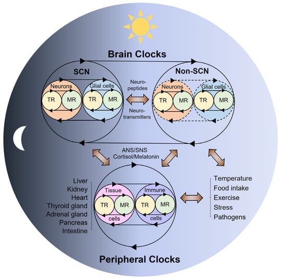 Since the formation and settlement of our solar system roughly 4.5 billion years ago, the Earth has been rotating on its axis and revolving around the Sun, bringing about continuous light and dark cycles on this planet. In accordance with these cycles, nearly all living unicellular and multicellular organisms have evolved rhythmic life processes controlled by the circadian clock (from the Latin phrase circa diem meaning “about a day”), which have about 24 h periods and constantly predict and adapt to daily environmental changes [1]. This internal timing system is believed to help organisms survive by increasing their ability to timely anticipate the cyclic changes of light and food availability as well as predation risk. At the unicellular level, the timely compartmentalization of the organism’s biochemical, metabolic, and redox processes, coordinated by the intrinsic clockwork, ensures the temporal fitness of cell physiology and functions across species [2]. In lower eukaryotic species, biological timers may help single-celled organisms escape the DNA-damaging effects of ionizing radiation from sunlight as well as oxidative stress during cell division [3]. In higher, complex organisms, including humans, common cellular oscillators constitute the brain and peripheral tissue clocks that interconnect to form a circadian network at the whole-body level. Interestingly, human or cross-species studies reveal differences in behavioral chronotype not only between species but also within and between different individuals of each species, suggesting the extent of intra- and inter-subject variability of circadian timing systems [4,5,6,7,8]. With periodic anticipation and synchronization to day–night cycles, these internal timing systems, in concert, coordinate rhythmic physiology and behaviors such as the sleep–wake cycle, body temperature, blood pressure, hormone production, neural and immune system processes, and cell proliferation [9,10].