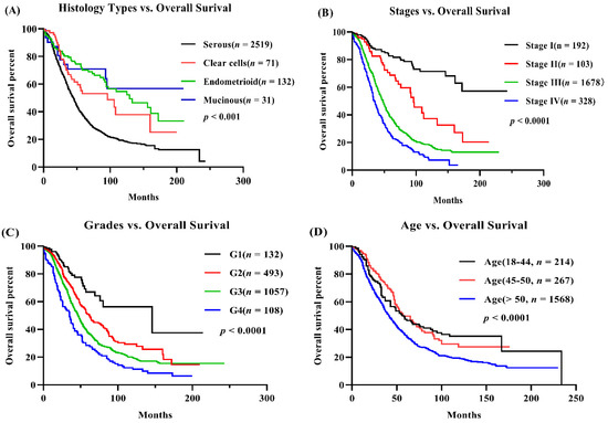 Figure 1. Clinico-pathological factors affect overall survival in ovarian cancer. (A) Histological types vs. overall survival (OS) of ovarian cancer; (B) Stages vs. OS; (C) Grades vs. OS; (D) Age vs. OS.