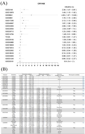 As a demonstration, Tan et al. reported that CRYAB is a poor prognostic biomarker for ovarian cancer, with higher expression in ovarian cancer tissue than normal tissue [50]. Open the OSov homepage (http://bioinfo.henu.edu.cn/OV/OVList.jsp (accessed on 20 December 2021)), type “CRYAB” into the gene symbol textbox (cutoff value: Upper25%) and press the “Survival analysis” button; then the homepage will display a forest plot (Figure 2A) and a uni/multi-variate survival summary table for CRYAB gene (Figure 2B). The OSov results showed that ovarian cancer cases with high expression of gene CRYAB were significantly associated with poor overall survival in forest plot and the survival analysis summary table (Figure 2A,B), containing seven significant cohorts (Figure 3A–G): GSE3149 [p = 0.0004, HR(95%CI) = 2.36 (1.47~3.81)], GSE13876 [p = 0.0021, HR(95%CI) = 1.49 (1.15~1.92)], GSE8841 [p = 0.0037, HR(95%CI) = 4.83 (1.67~13.96)], GSE9891 [p = 0.0086, HR(95%CI) = 1.76 (1.15~2.69)], GSE17260 [p = 0.0187, HR(95%CI) = 2.12 (1.13~3.96)], GSE49997 [p = 0.0249, HR(95%CI) = 1.87 (1.08~3.23)], and GSE32063 [p = 0.0323, HR(95%CI) = 2.89 (1.09~7.66)]. Furthermore, the additional multivariate analysis showed that CRYAB is not an independent ovarian cancer prognostic biomarker and its prognostic role may be because of the close association with other prognostic clinical factors, such as age, grade or race (Figure 2B).