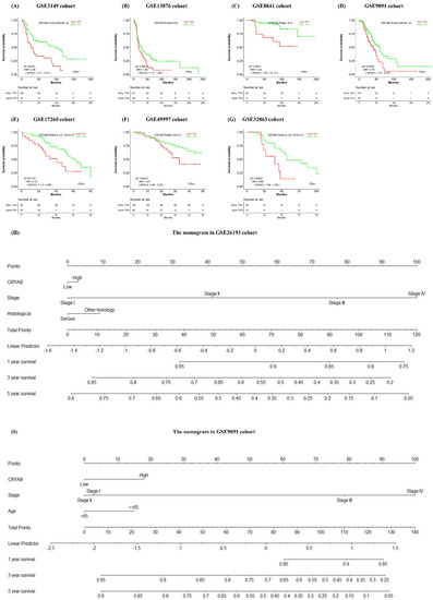 Figure 3. CRYAB is prognostic in ovarian cancer by OSov. (AG) the overall survival (OS) analysis for CRYAB gene in GSE3149, GSE13876, GSE8841, GSE9891, GSE17260, GSE49997 and GSE32063 cohort, respectively; (H,I) the nomograms for CRYAB gene in GSE26193 and GSE9891, respectively. CRYAB: crystallin alpha B.
