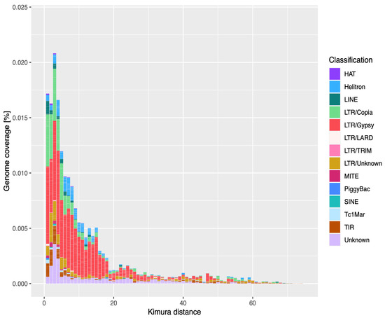 Finally, we performed a copy divergence analysis of TE classes based on Kimura distances by calculating Kimura 2-parameter divergence [63] between each TE copy and its consensus sequence using the utility scripts provided in the RepeatMasker package. These were also used to construct a TE landscape divergence plot by grouping copies within TE superfamilies and calculating the percentage of the genome occupied by each TE superfamily.