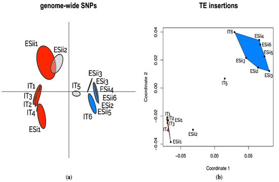 We further compared population structure based on 447,470 genome-wide SNPs (dataset available at: 10.6084/m9.figshare.14784579 (accessed on 8 November 2021)), with the population divergence based on the variations of TE frequencies across populations. Both SNP-based and TE frequency-based ordinations show that populations can be grouped into two clearly distinct clusters corresponding to the Mediterranean and cold temperate ecotypes of the lichen-forming fungus sensu [54] (Figure 2).