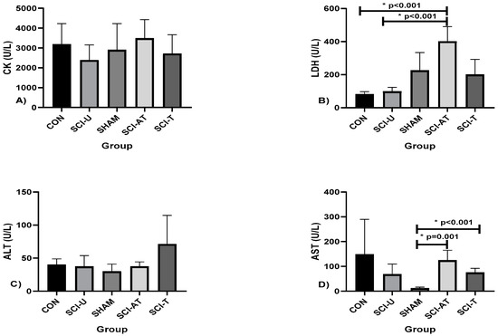 There was no difference in CK and ALT among the groups. In relation to the LDH there was difference between CON and SCI-U, and in relation to SCI-AT groups (p < 0.001, F(4,28) = 88.118; η2p = 0.926, very high effect). Regarding AST levels, there were differences between SHAM and SCI- AT groups (p = 0.001) and SCI-T (p < 0.001; F(4,28) = 5.275; η2p = 0.433, high effect).