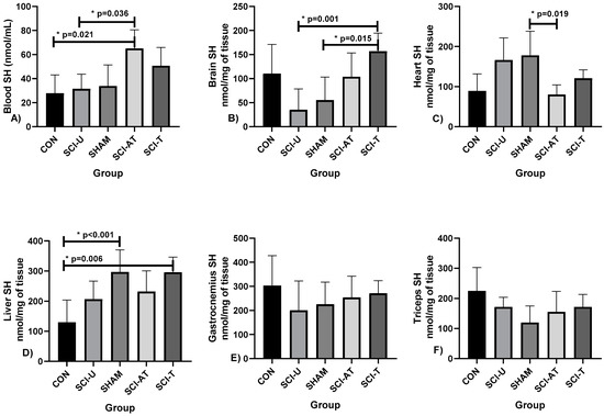 For blood concentration of SH, there were differences between SCI- AT and SCI- U groups (p = 0.021) and between SCI- AT and CON groups (p = 0.036; F(4,28) = 8.452; η2p = 0.547) (very high effect). There were differences in SH brain levels between SCI-T and SCI-U groups (p = 0.001) and SCI- T and SHAM (p = 0.015, F(4,28) = 7.150; η2p = 0.505, very high effect). In heart SH analysis, there were differences between SHAM and SCI- AT groups (p = 0.019; F(4,28) = 7.781; η2p = 0.526 (high effect). There were differences in SH liver levels between CON and SHAM groups (p < 0.001) and CON and SCI-T (p = 0.006, F(4,28) = 9.813; η2p = 0.584, very high effect). In liver SH analysis, there were differences between SHAM and SCI- AT groups (p = 0.019; F(4,28) = 7.781; η2p = 0.526 (high effect). There were no differences between the groups in relation to gastrocnemius and triceps muscles.