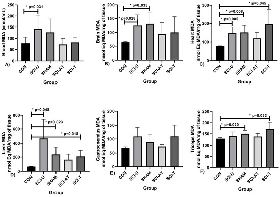 Malondialdehyde (MDA) levels analysis showed differences between CON and SCI-U groups (p = 0.031; F(4,28) = 7.194; η2p = 0.507) (very high effect). Regarding MDA levels in the brain, there were differences between CON and SCI-U groups (p = 0.028) and CON and SHAM groups (p = 0.035, F(4,28) = 3.685; η2p = 0.343, high effect). In heart MDA levels, there were differences between CON and SCI-U (p = 0.005), CON and SHAM (p = 0.008) and CON and SCI-T (p = 0.045; F(4,28) = 10.511; η2p = 0.600 (very high effect). Regarding liver MDA levels, there were differences between CON and SCI-U groups (p = 0.048), CON and SHAM (p = 0.023) and CON and SCI-T groups (p = 0.018; F(4,28) = 9.814; η2p = 0.584 (very high effect). In Tríceps MDA levels, there were differences between the groups CON and SHAM (p = 0.020) and CON and SCI-T (p = 0.033; F(4,28) = 6.973; η2p = 0.499 (high effect), while in gastrocnemius there was no difference between groups.