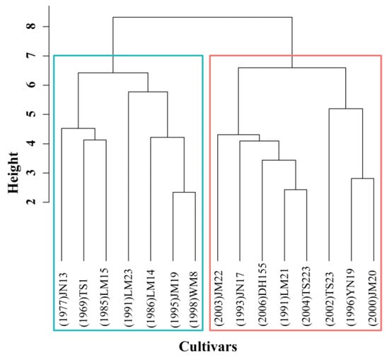 Similarity among 15 wheat cultivars estimated by hierarchical cluster analysis. Abscissa: wheat cultivar clustering categories. Each vertical line represents one category. Ordinate: relative distance of each category. Cluster 1 is outlined in blue and comprises JN13 (Jinan13), TS1 (Taishan1), LM15 (Lumai15), LM23 (Lumai23), LM24 (Lumai14), JM19 (Jimai19), and WM8 (Weimai8). Cluster 2 is outlined in red and comprises JM22 (Jimai22), JN17 (Jinan17), DH155 (Zhongmai155), LM21 (Lumai21), TS223 (Taishan223), TS23 (Taishan23), YN19 (Yannong19), and JM20 (Jimai20).