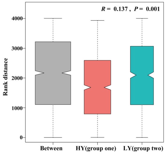 Similarity analysis of the LY and HY groups wheat cultivars. Box plots showing rank distributions between (Between) and within (LY and HY) groups. Y-axis represents rank distance. Grooves on both sides of boxes represent confidence intervals of median. Upper and lower box edges represent 25th and 75th percentiles of all data, respectively. Lengths of lines at the bottom and top represent 5th and 95th percentiles, respectively. R (ANOSIM statistic R) indicates degree of difference between and within groups, where the range is (−1, 1). R > 0 indicates that the differences between groups are significant and greater than those within groups. p < 0.05 indicates statistical significance. LY and HY groups are Cluster 1 and Cluster 2 in Figure 1, respectively.