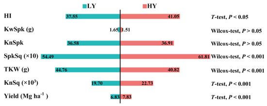 T-tests and non-parametric tests were conducted to compare yield, harvest index (HI), and yield components between the LY and HY groups (Figure 3). Grain yield, kernels per square meter (KnSq), and spikes per square meter (SpkSq) were extremely significantly (p < 0.001) higher for the HY than for the LY group. The HI of HY group was also significant (p < 0.05) higher. In contrast, thousand-kernel weight (TKW) of HY group was extremely significantly lower than the LY group (p < 0.001). Neither kernel weight per spike (KwSpk) nor kernels per spike (KnSpk) significantly differed between LY and HY groups. Thus, the HY group has a large sink compared to the LY group.
