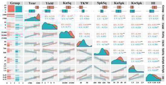 Correlation matrices for grain yield (Yield), kernels per square meter (KnSq), thousand-kernel weight (TKW), spikes per square meter (SpkSq), kernels per spike (KnSpk), kernel weight per spike (KwSpk), and harvest index (HI) for seven LY group (blue) and eight HY group (red). HY and LY groups are shown in Figure 1. *** p < 0.001; ** p < 0.01; * p < 0.05.