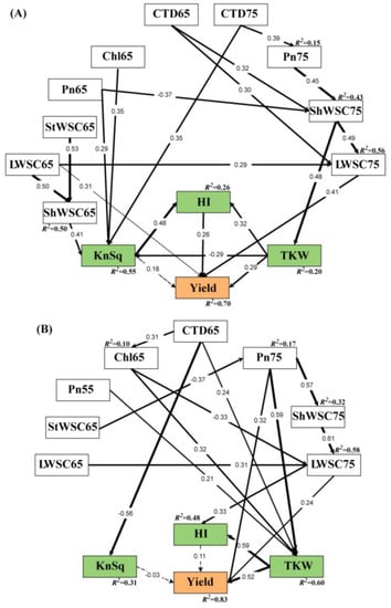 Structural equation modeling (SEM) showing effects of yield, kernels per square meter (KnSq), thousand-kernel weight (TKW), and harvest index (HI). Contributions of photosynthetic rate (Pn), chlorophyll content (Chl), canopy temperature depression (CTD), water-soluble carbohydrate in flag leaf (LWSC), water-soluble carbohydrate in stem (StWSC), and water-soluble carbohydrate in flag leaf sheath (ShWSC) at heading (DC55), anthesis (DC65), and grain filling stage (DC75) to grain yield. Black lines and arrows indicate significant pathways (p < 0.05), with line thickness representing significance. Progressively greater significance levels are represented by increasing thicknesses of the solid lines. No line or dotted lines indicate non-significant paths (p > 0.05). Coefficients indicate the strength of the association between variables, while arrows indicate directionality. R2 Values indicate the proportion of total variance for a variable explained by the model. For the seven LY group (A), x2/df = 1.054; p = 0.367; GFI = 0.819; CFI = 0.984; RMSEA < 0.05. For the eight HY group (B), x2/df = 1.199; p = 0.176; GFI = 0.829; CFI = 0.966; RMSEA < 0.05. Abbreviations are explained in Table S2. HY and LY groups are shown in Figure 1.