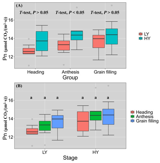SEM analysis demonstrated that Pn of flag leaves plays an important role in yield improvement. We used box plots to analyze the differences in Pn of flag leaves between the LY and HY groups at various stages (Figure 6). In the LY group, the mean values of Pn at the heading stage, flowering stage, and filling stage were 12.586, 13.116, and 13.604, respectively, while in the HY group, they were 13.700, 14.473, and 14.429. There was no significant difference in Pn between three stages of LY and HY group. At three stages, especially at anthesis, the Pn was higher for the HY group than for the LY group and the differences were significant (p < 0.05). However, there were no significant differences in Pn between LY and HY groups at heading or grain filling stage. The Pn of the LY group increased from heading to grain filling stage and the median range was 12.567–13.964. In contrast, the Pn of the HY group peaked at anthesis (median = 14.159) but remained high at filling stage (median = 14.217). Hence, the HY group had prolonged active photographic duration than the LY group.