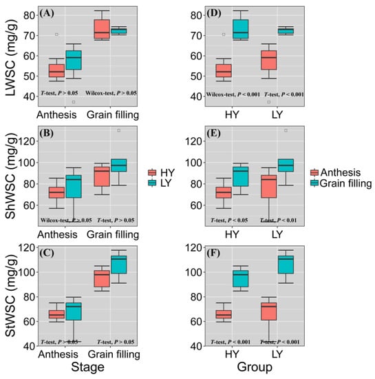 Water-soluble carbohydrate content in flag leaf (LWSC) (A,D), flag leaf sheath (ShWSC) (B,E), and stem (StWSC) (C,F) at heading (DC55), anthesis (DC65), and grain filling (DC75) stages for seven LY cultivars and eight HY cultivars. Solid lines within boxes indicate medians. Upper and lower box edges represent 25th and 75th percentiles of all data. Lengths of lines at bottom and top represent 5th and 95th percentiles, respectively. HY and LY groups are shown in Figure 1. T-test: Student’s t-test; Wilcox-test: Wilcoxon rank-sum test; p < 0.001: extremely significant difference; p < 0.05: significant difference; p > 0.05: no significant difference.