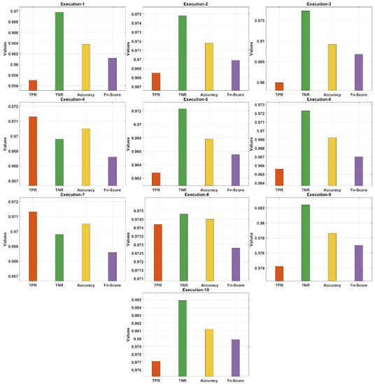 Table 1 and Figure 5 demonstrate the confusion matrix of the AIEM-DC technique under 10 execution rounds. The obtained results highlighted the effectual outcome of the AIEM-DC technique under every round. For instance, with execution-1, the AIEM-DC technique has obtained a TPR of 0.9570, TNR of 0.9698, accuracy of 0.9638, and F-score of 0.9612. In addition, with execution-4, the AIEM-DC method has gained a TPR of 0.9713, TNR of 0.9698, accuracy of 0.9705, and F-score of 0.9686. In addition, with execution-6, the AIEM-DC approach has reached a TPR of 0.9656, TNR of 0.9723, accuracy of 0.9692, and F-score of 0.9670. Moreover, with execution-8, the AIEM-DC system has achieved a TPR of 0.9742, TNR of 0.9748, accuracy of 0.9745, and F-score of 0.9728. Finally, with execution-10, the AIEM-DC methodology has gained a TPR of 0.9771, TNR of 0.9849, accuracy of 0.9812, and F-score of 0.9799.