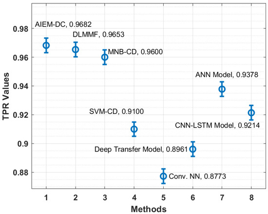 In order to showcase the effectual outcome of the AIEM-DC technique, a detailed comparison study is made with recent techniques in Table 2 [35]. Figure 6 showcases the TPR analysis of the AIEM-DC technique with existing techniques. The figure demonstrated that the Conv. NN and deep transfer models have obtained ineffective outcomes with the lower TPR of 0.8773 and 0.8961, respectively. In addition, the SVM-CD and CNN-LSTM techniques have attained slightly enhanced TPR of 0.9100 and 0.9214, respectively. Followed by, the ANN and MNB-CD techniques have showcased reasonable TPR of 0.9378 and 0.9600, respectively. Furthermore, the DLMMF technique has accomplished near-optimal outcomes with the TPR of 0.9653. However, the proposed technique has resulted in improved performance with a TPR of 0.9682.