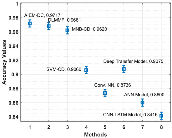 Figure 8 depicts the accuracy analysis of the AIEM-DC method with state-of-the-art algorithms. The figure outperformed that the CNN-LSTM and ANN manners have gained ineffective outcomes with the least accuracy of 0.8416 and 0.8600 correspondingly. Moreover, the Conv. NN and SVM-CD manners have achieved slightly superior accuracy of 0.8736 and 0.9060, respectively. At the same time, the deep transfer and MNB-CD techniques have depicted reasonable accuracy of 0.9075 and 0.9620 correspondingly. Additionally, the DLMMF algorithm has accomplished near-optimal results with an accuracy of 0.9681. Finally, the presented technique has resulted in maximum efficiency with an accuracy of 0.9717.