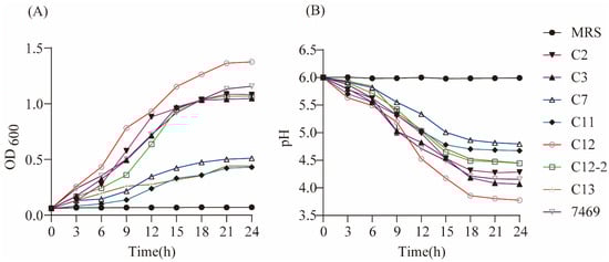 Growth and acid-producing ability were measured according to a method from a previous study [8]. The strains were inoculated (1%, v/v) in an MRS broth culture medium and incubated anaerobically at 37 °C for 24 h and shaken at 170 rpm. Viable bacteria were measured with an enzyme-labeling measuring instrument at 600 nm (OD600 nm) at approximately 3 h intervals. Meanwhile, the pH of the cultures was measured using a digital pH meter. Three independent experiments were performed for each strain, and the growth curve and acid-producing curve were plotted using MRS broth as a control.