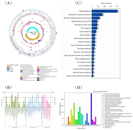 Whole-genome sequencing of selected strains. (A) The complete circular genome map of strain CY12; the outermost circle of the circle diagram is the marker of genome size, and each scale is 0.5 MB; the second and third circles are CDS on the positive and negative chains. Different colors indicate the functional classification of different COG of CDS. The fourth circle is rRNA and tRNA; the fifth circle is GC content. The outward red part indicates that GC content in this region is higher than the average GC content in the whole genome. The higher the peak value, the greater the difference between GC content in this region and the average GC content. The innermost circle is the GC skew value, and the specific algorithm is G-C/G + C. In the biological sense, when the value is positive, the positive chain is more inclined to transcribe CDS; when the value is negative, the negative chain is more inclined to transcribe CDS (the form of the circle graph is flexible, and the above is only the most traditional form); (B) gene ontology (GO) analysis of strain CY12 genome; (C) KEGG pathways enrichment for strain CY12 genome; (D) the Clusters of Orthologous Groups of proteins (COG) functional classification of the CY12 strain genome.