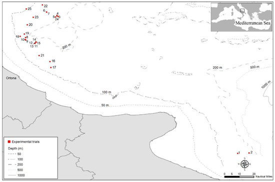 The experimental survey was mainly conducted within GSA 17, an exploited area which extends to 60 miles off the Ortona Maritime Compartment, which was investigated through experimental trials (Figure 1). Only two experimental trials were carried out in the Southern Adriatic Sea (GSA 18) off the coast of the Gulf of Manfredonia because of bad weather conditions in GSA 17.