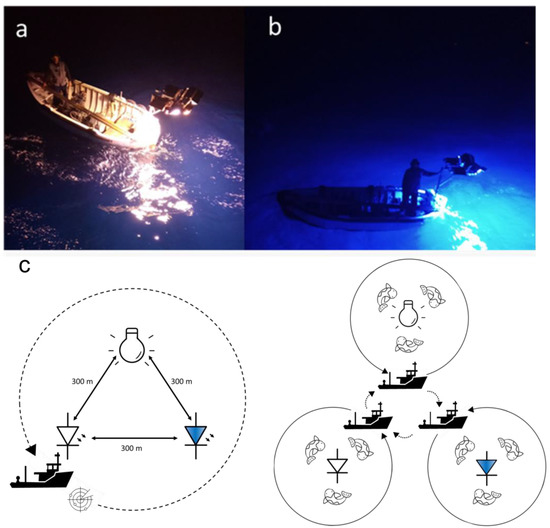 LEDs (a) white LED light, (b) blue LED light, and (c) outline of fishing operations conducted during experimental trials.