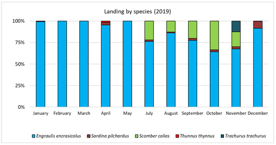In order to identify the most important target species, and to check for any anomalies in the experimental trials with respect to the usual catches by the PS vessel in the fishing area and period, monthly catch data and fishing days relative to 2019 were collected from the logbook provided by the fishermen (Table A2). In particular, anchovy was the main target species harvested in 2019, which showed a monthly landing value always above 60% of the total, with landings of approximately 44 t and 63.5 t in September and October, respectively (Figure 3). In addition, in these two months, the second important target species was the Atlantic chub mackerel (Scomber colias, Scombridae), with a percentage monthly landing of approximately 20–30%.