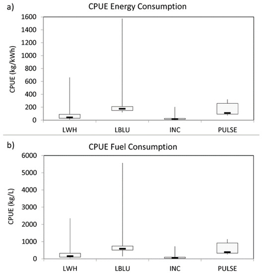 Considering the catch efficiency, the CPUE per energy consumption of LBLU (median value of 177 kg kWh−1, IR = 59.60) was significantly higher than that of INC (median value of 18 kg kWh−1, IR = 15.30; U = 7, p < 0.001) and LWH (median value of 42 kg kWh−1, IR = 62.04; U = 19, p < 0.001) (Figure 4a and Table A6). Moreover, the PULSE (median value of 111 kg kWh−1, IR = 165.44) together with LWH proved to be significantly more efficient than INC (U = 3, p < 0,05; U = 75, p < 0.05, respectively). Similar differences were observed for the CPUE per fuel consumption, where that of LBLU (median value of 593 kg L−1, IR = 233.48) was significantly higher than INC (median value of 62 kg L−1, IR = 70.80; U = 9, p < 0.001) and LWH (median value of 159 kg L−1, IR = 219.73; U = 30, p < 0.01) (Figure 4b and Table A6). In addition, the median CPUE of INC was significantly lower than LWH (U = 70, p < 0.01) and PULSE (median value of 392 kg L−1, IR = 585.93; U = 3, p < 0.05).