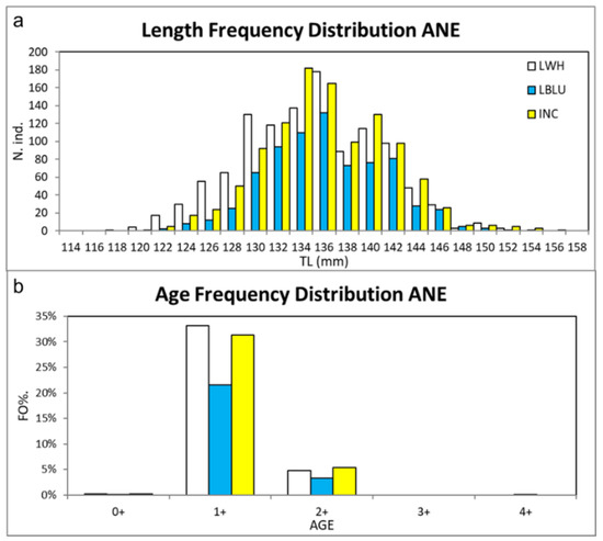 (a) Length–frequency distribution (LFD) of the total length (TL in mm) and (b) age frequency distribution calculated for the anchovies (ANE) sampled using LWH, LBLU, and INC. Outliers of TL values, out of the range 114–159 mm, were excluded from the plot.