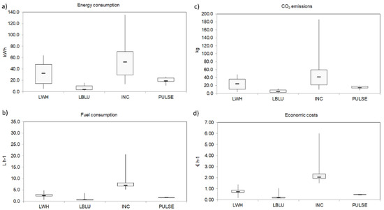 CPUE (energy, kg kWh−1, and fuel consumption, kg L−1), CO2 emissions (kg), and hourly fuel consumption (L h−1) by LWH, LBLU, PULSE, and INC estimated by 20 experimental trials (Tr.) used in the statistical analysis.