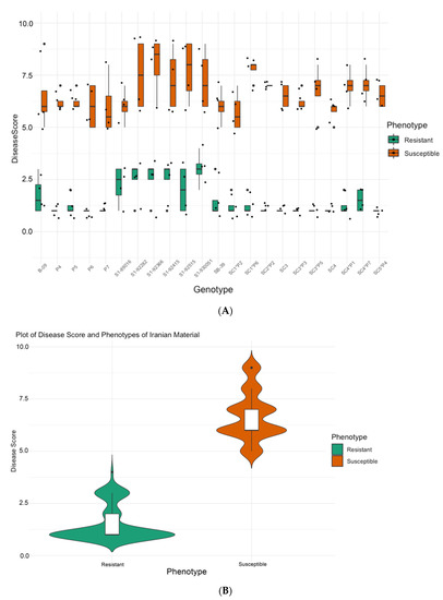 (A) Distribution of disease severity [2] scores across tested germplasm from SBSI which shows the range of variation for plants from each variety classified as resistant and susceptible. (B) Resistance trait summary plot of material grouped based on phenotype, the width of the shaded area can be correlated with the density of the data points.