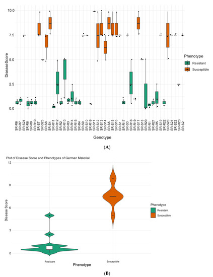 (A) Distribution of disease severity [2] scores across tested germplasm from Germany. The range of variation for plants from each variety classified as resistant and susceptible is shown. (B) Resistance trait summary plot of material from grouped based on phenotype. The width of the shaded area can be correlated with the density of the data points.