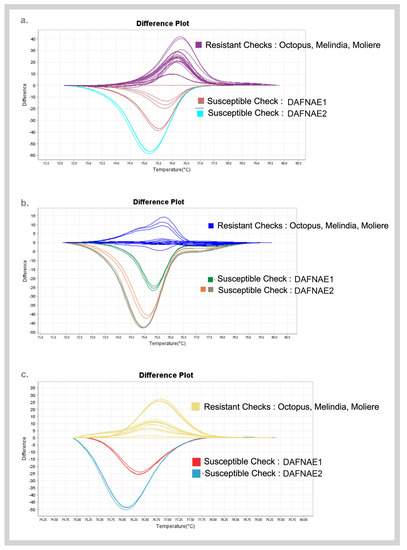 Melt curve profiles of best targets (a) SNP94 (Chr6), (b) SNP23 (Chr9), and (c) RsBv1 (Chr6) from high-resolution melting analyses discriminating the resistant and susceptible checks.
