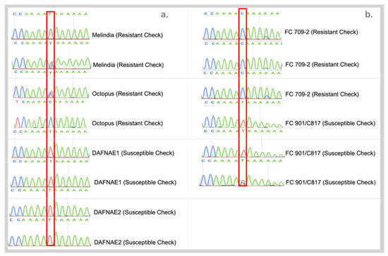 A subset of SNP candidates was studied for its contribution in discriminating resistance/susceptible phenotypes from the bioinformatics analysis that were subsequently screened using high-resolution melting (HRM) analysis. Figure 4 shows the representative melt curve profiles of SNP target sequences with the highest difference in the melting temperature between the contrasting phenotypes. The differences in the melt curves are due to differences in the sequence composition between resistant and susceptible checks which confirm the presence of the SNP. Convincing SNP targets from this screening were taken further for Sanger sequencing.