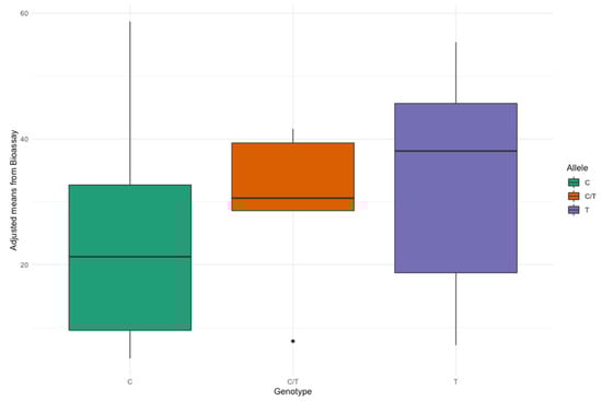 The availability of a range of breeding materials for Rhizoctonia resistance allowed us to correlate the marker genotypes obtained for 157 plants from 62 breeding lines with their disease scores obtained from the adjusted means of the percentage of infection (Supplementary Materials Figure S4). Figure 6 shows the differences observed between the groups while comparing the adjusted means from the bioassay with the allelic status—C/C, C/T, and T/T.