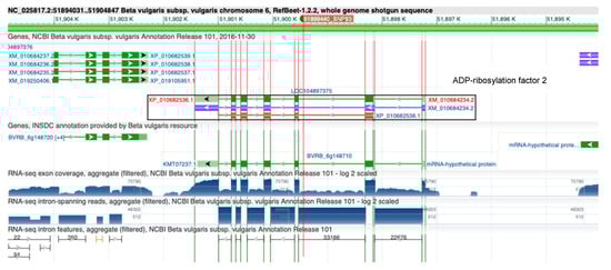 Genomic context of RsBv1 in the RefBeet1.2.2 sugar beet reference genome [29]. It is located within the intron of LOC104897375 coding for ADP-ribosylation factor 2.