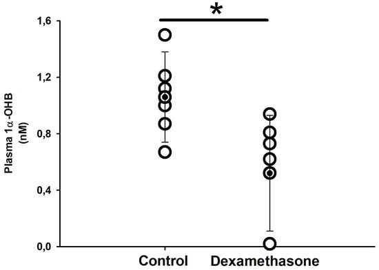 Plasma 1α-OHB in catsharks (S. canicula) 7 days after IP-injection of control or dexamethasone (Dex) slow-release implants. Data are expressed as single plots per individual. Mean and SD are shown as black dots and vertical lines, respectively. The asterisk (*) indicates significant differences between both groups (p < 0.05, Student´s t-test, n = 7).