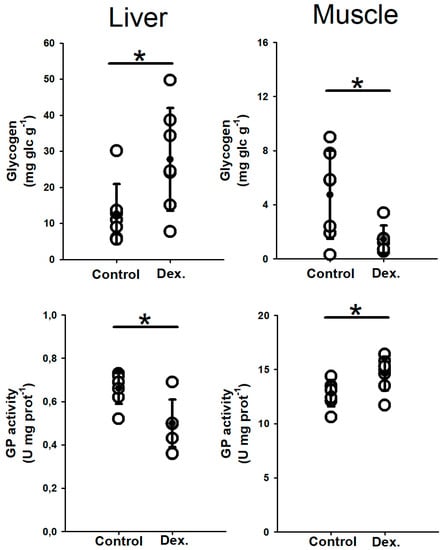 In this sense, the teleost Sparus aurata enhanced, during chronic administration of cortisol and dexamethasone, the general catabolism at the cost of compromising its body growth []. However, these authors described great differences in carbohydrate metabolism responses depending on the target tissue. Thus, the liver in fish act as a key organ of energy storage, mostly in the form of glycogen and triglycerides [,], while muscle has glycogen, which can be required to fuel glycolysis []. Furthermore, it was described that corticosteroids stimulate hepatic gluconeogenic pathways and consumption of white muscle glycogen stores in vertebrates [,,].