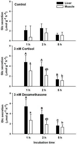 Glucose secretion rates (µmol g−1 h−1) in liver and muscle of S. canicula after 1, 2, and 5 h of incubation with DMSO alone (control group), 3 nM cortisol, or 3 nM dexamethasone. Glucose secretion at each time is represented by black bars (liver) or white bars (muscle). Data are expressed as mean ± SD. Different capital and lowercase letters indicate significant differences with time for the liver and muscle, respectively (p < 0.05, one-way ANOVA followed by a Tukey´s post hoc test, n = 6).