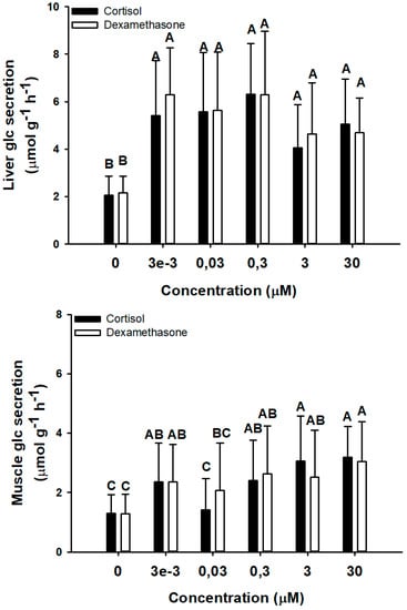 Glucose secretion rates (µmol g−1 h−1) in liver and muscle of S. canicula after 1 h ex vivo incubation under a range of cortisol (black bars) and dexamethasone (white bars) concentrations (0, 0.003, 0.03, 0.3, 3, and 30 µM). Data are expressed as mean ± SD. Different capital letters indicate significantly different groups (p < 0.05, two-way ANOVA followed by a Tukey´s post hoc test, n = 16 explants per tissue, from 2 adult females).