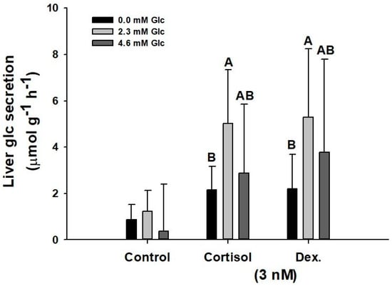 Hepatic glucose secretion rates (µmol g−1 h−1) after 1 h ex vivo incubation with 3 nM cortisol or dexamethasone and different initial glucose concentrations in the incubation medium (0.0, 2.3, or 4.6 mM) in S. canicula. Data are expressed as mean ± SD. Different capital letters indicate significant differences due to initial glucose concentration for each hormone (p < 0.05, two-way ANOVA followed by a Tukey´s post hoc test, n = 6).