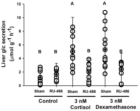 Glucose secretion rates (µmol g−1 h−1) in liver explants of S. canicula incubated with 3 nM cortisol or dexamethasone and a glucocorticoid specific inhibitor (30 µM RU-486 or mifepristone, white bars). The sham-control group was incubated in the presence of DMSO as the solvent necessary to pre-dissolve these compounds. Each dot represents a single explant (two liver explants, duplicates, per animal). Mean and SD are shown as black dots and vertical lines, respectively. Different capital letters indicate significantly different groups (p < 0.05, two-way ANOVA followed by a Tukey´s post hoc test, n = 6 animals).