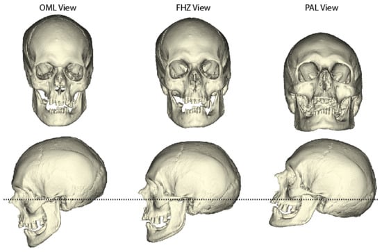 The third view, which we termed the Porion-Alveolar Line (PAL), was primarily chosen for comparative purposes, as it represents a superior rotation of the head and is utilized in several previous studies investigating the effect of orientation on frontal sinus morphology. Following Silva et al. [] and Nikolova et al. [], we obtained this view by rotating the cranium 20° superiorly from FHZ (Figure 1, right). It is important to note, however, that these previous studies misleading refer to this orientation as “Caldwell view,” which does not match the clinical definition. Clinically, Caldwell’s view is obtained by having the patient put their forehead and nose against the X-ray film and then orienting the X-ray beam at a 15–20° angle to the film []. In this orientation, the head position resembles the OML view, but the X-ray beam traverses from the occipital bone (near lambda) through the mid-orbit region. The superior rotation of the cranium 20° from FHZ (as done by Silva et al. [] and Nikolova et al. []), rotates the head in the opposite direction as the clinical Caldwell head orientation and results in an X-ray beam trajectory passing through the porion and the maxillary alveolus, very different from that of actual Caldwell’s view. Further, the end result of Caldwell’s view should consist of the petrous pyramids located in the lower third portion of the orbits [], which is not evident in the figures provided by Nikolova et al. []. While we find this view informative for reasons below, we do not use the “Caldwell” notation in this study. Instead, we refer to it as the Porion-Alveolar Line (PAL), as this more accurately reflects the beam trajectory through the cranium. Despite not being defined as a typical clinical view, we include PAL here for comparative purposes given that these previous studies used this orientation, found that it was the most stable in terms of frontal sinus morphology across varying vertical orientations, and provided the clearest view of the sinus [,]. Its incorporation also provides additional insight into how superior vertical inclination of the cranium may affect frontal sinus morphology. Given the relationship of FHZ and OML axes, the PAL orientation can be inferred to be approximately 30° superiorly rotated from the OML line. While Water’s view, defined as 45° superior rotation from the OML view, is a clinical view that could have been investigated, it was not specifically tested in this study given that its extreme superior rotation has already been shown to be highly susceptible to vertical deviations [,,]. Further, preliminary investigations in the current study indicated that Water’s view would result in several instances where the frontal sinus would be eliminated completely from view. The PAL view provides a test of a less-extreme vertical orientation.