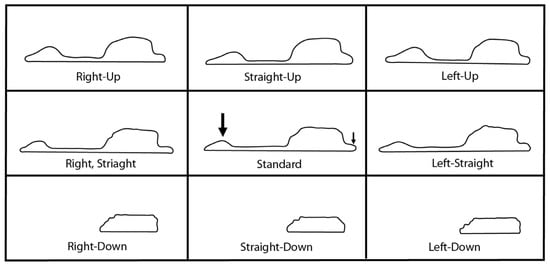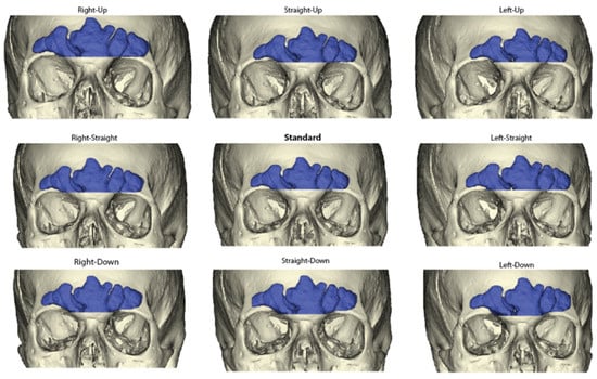 The associated frontal sinus and cranial models for each individual were imported into the program 3DSlicer []. The models were oriented into these three main orientations (FHZ, OML, PAL) using cranial landmarks, and then eight additional views varying in 5° intervals from each of the main orientations, resulting in 27 radiographic views per individual. The Transformation module was used to digitally rotate the models to the defined degrees and alleviate human error in obtaining the 5° rotations. Within each view, the 5° deviations were defined from the standard orientation as horizontal deviations (5° left; 5° right), vertical deviations (5° up; 5° down), and diagonal deviations (5° left and up; 5° right and up; 5° left and down; 5° right and down). These are illustrated in Figure 2; note the cranial model is included for interpretative purposes only and was not included when obtaining sinus outlines as described below.